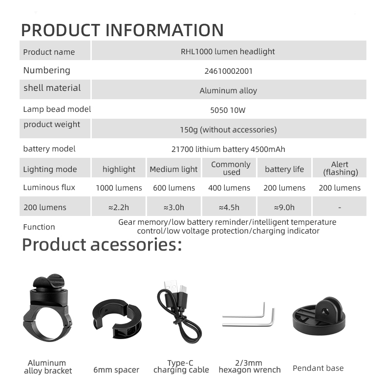 ROCKBROS Aluminum shell Bike light 1000LM Smart Light USB Rechargeable LED Light High quality Flashlight Cycling Headlight Front Light Waterproof light