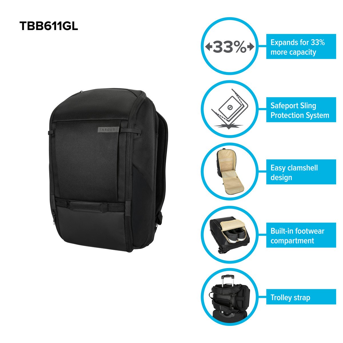 Targus 15-16" Work+ Expandable 32L Daypack, Black (TBB611GL)