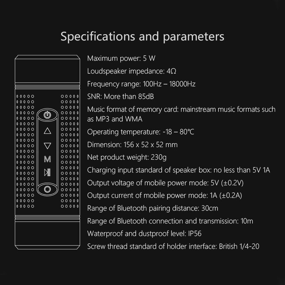 • The music stored in the intelligent devices, such as TF card, USB, AUX audio, mobile phone, tablet PC, laptop, etc, can be played after being connected with Bluetooth and main body interfaces with multiple specifications.