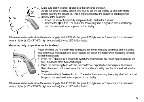 • 6 in 1: Measurement within seconds in the ear, Forehead temperature measurement in seconds, Surface temperature of objects and liquids, Optical high temperature alarm, Date and Time, 10 memory spaces