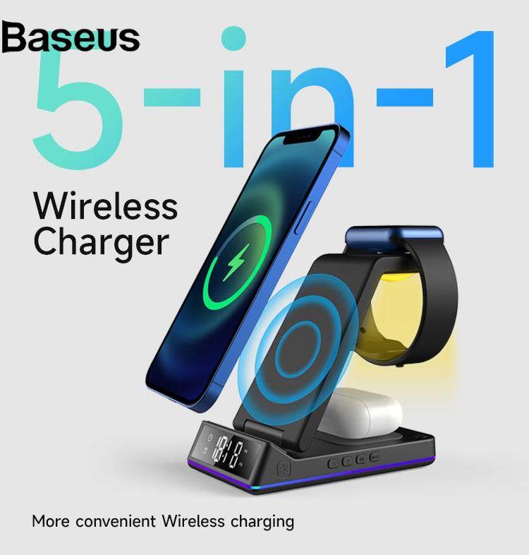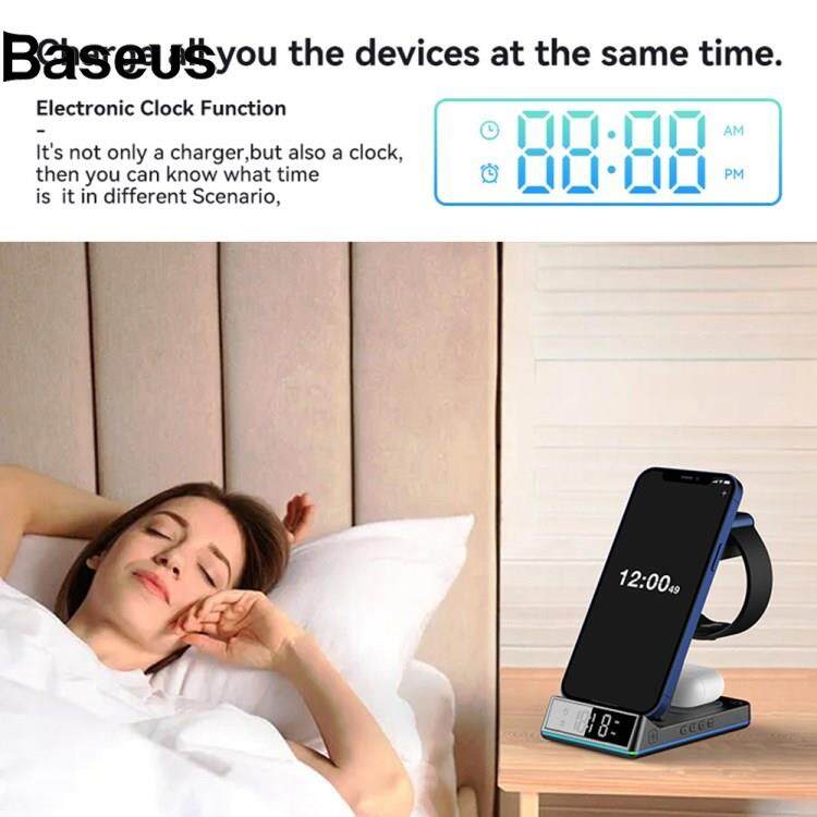 Baseus Z6 Foldable 5-in-1 15W Magnetic Wireless Charger with Flashy Atmosphere Light/Digital Clock Multi-Function Wireless Charging Stand?24hrs ship out?