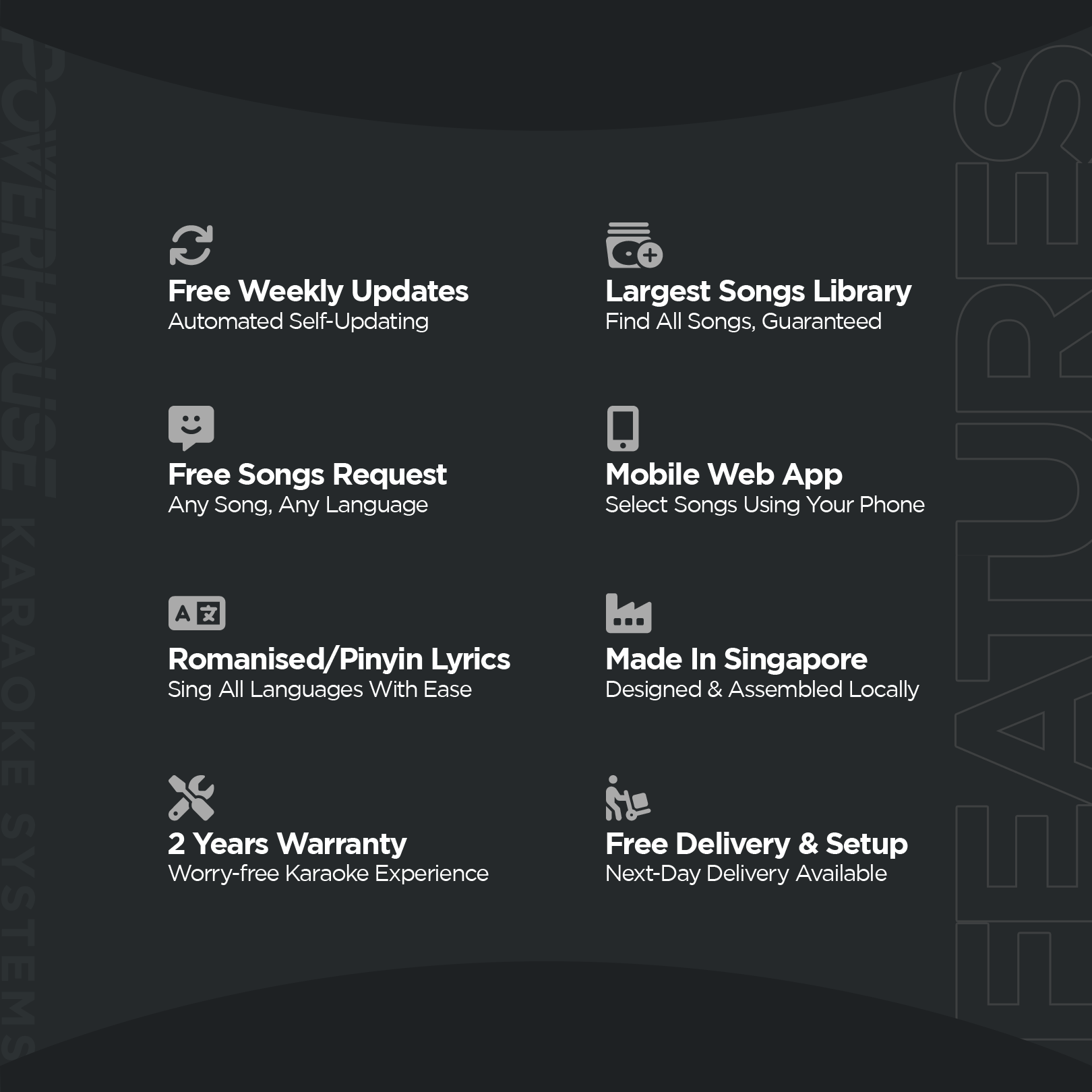 Karaoke system for home is now made affordable with our new "Powerhouse Slim Starter Home Karaoke System"! We have redesigned karaoke system speakers to be just 8cm thick, made specially for Singapore homes. Amazingly slim yet powerful with 450W of superb sound quality for that perfect home karaoke system experience! This karaoke system package comes complete with our flagship "Powerhouse Touchscreen Karaoke System With Songs" or "Powerhouse Android Box (Non-Touchscreen) Karaoke System With Songs" that includes all your karaoke songs preloaded with free automated weekly songs updates! Enjoy unlimited access to our entire Songs Library of 17 Karaoke Songs Languages. It's time to get a KTV system for your home now!
