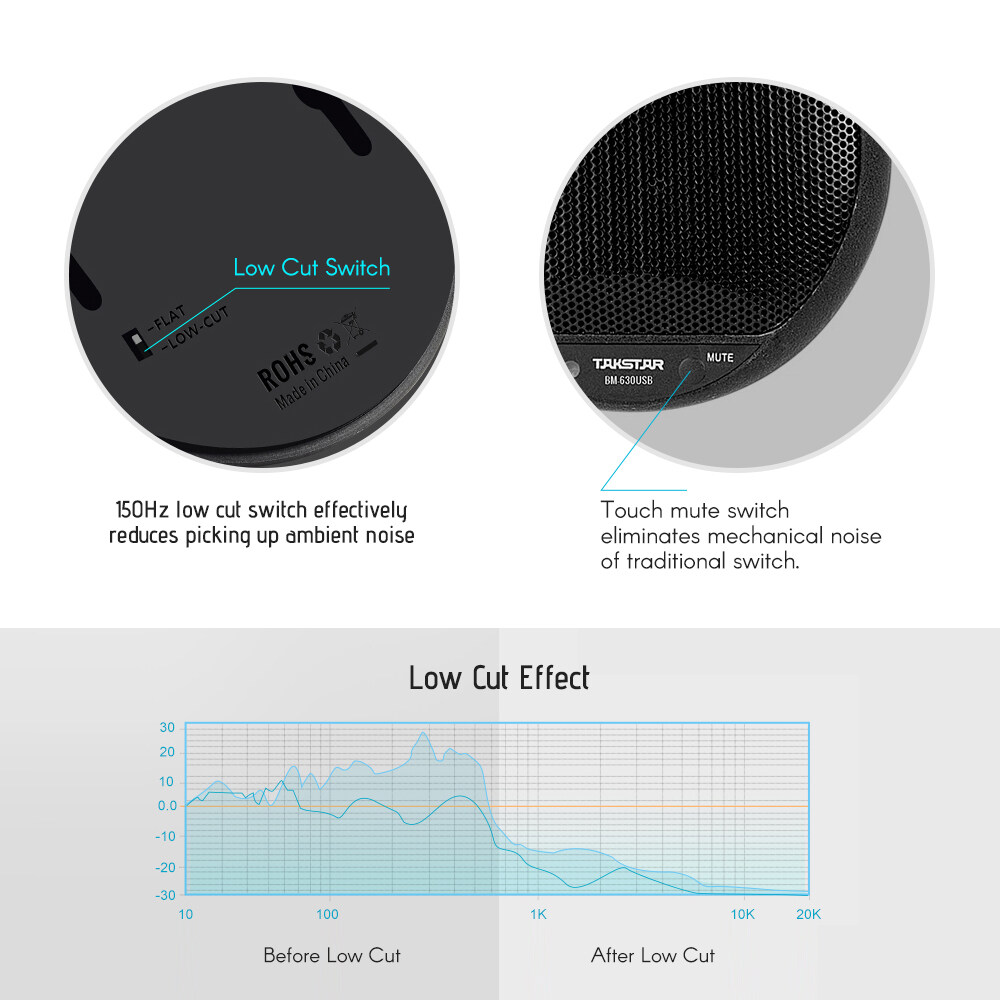 Anti-skidding pads prevents from microphone skidding or vibration on desktop; Touch mute switch eliminates mechanical noise of traditional switch.