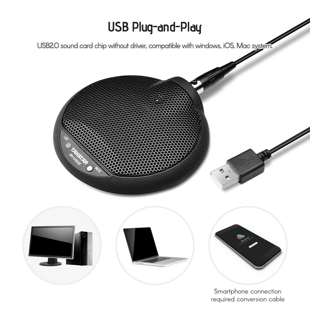 The digital boundary microphone tailored for network conference, network live broadcast, interview, etc. USB2.0 professional sound card chip without driver, plug and play, compatible with windows, iOS, Mac system.